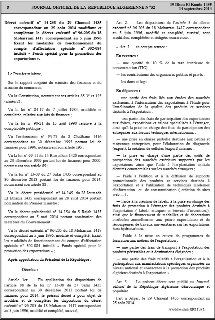 Il est porté à la connaissance des opérateurs économiques algériens que le dispositif du soutien et de promotion des exportations des produits algériens hors hydrocarbures a été modifié et ce,par décret exécutif n° 14-238 du 29 Chaoual 1435 correspondant au 25 Août 2014 modifiant et complétant le décret exécutif n° 96-205 du 18 Moharram 1417 correspondant au 5 juin 1996 fixant les modalités de fonctionnement du compte d’affectation spéciale n° 302-084 intitulé « Fonds spécial pour la promotion des exportations ». Ci-après le contenu du décret: