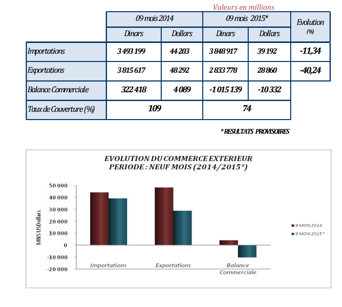 Les résultats en matière de réalisations du commerce extérieur de l’Algérie pour les neuf mois 2015 ont enregistré un déficit de la balance commerciale de 10,33 milliards de Dollars US, contre un excédent de 4,08 milliards de Dollars US, cette tendance s’explique essentiellement par les baisses respectives des exportations et des importations (40,24%) et (11,34%).