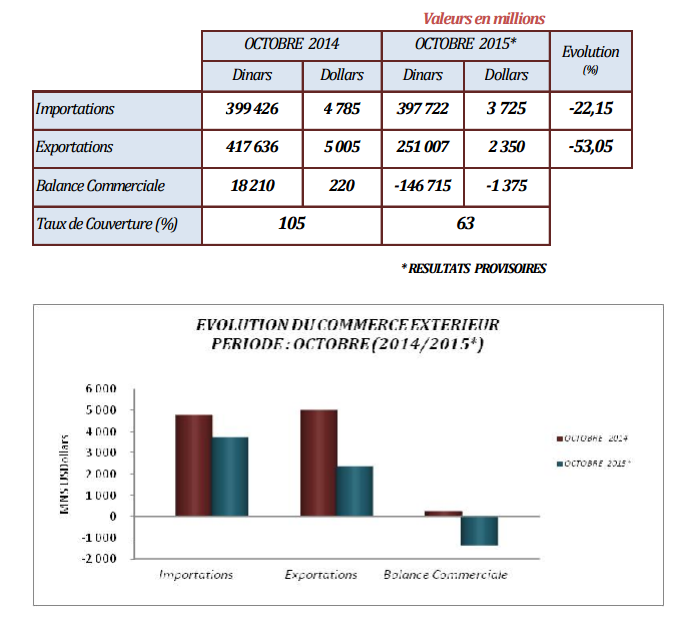 l’évolution de la balance commerciale et la structure des échanges extérieurs du commerce extérieur de l’Algérie ont enregistré au cours du mois d’octobre de l’année 2015 :