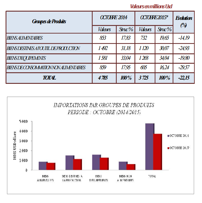 – Un volume global des importations de 3,72 milliards de dollars US soit une baisse de 22,15% par rapport aux réalisations du mois d’octobre 2014.