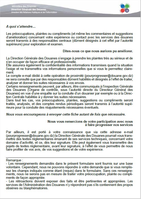Dans le cadre de ses actions de proximité et d’amélioration de la qualité de service, l’Administration des Douanes a entrepris un programme intitulé « pour progresser » visant à faire participer l’ensemble de ses partenaires et usagers à la promotion de l’accueil et des facilitations douanières d’une part, et à soutenir une communication utile et un partage d’expérience et de préoccupation, d’autre part.