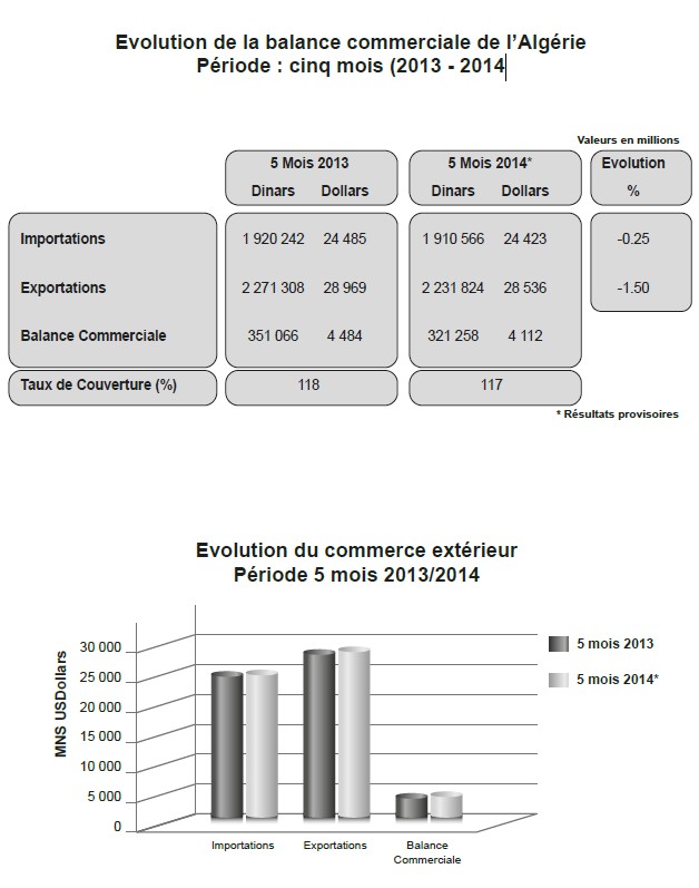Evolution de la balance commerciale et du commerce extérieur de l’Algérie durant la période des cinq premiers mois de 2013 et de 2014