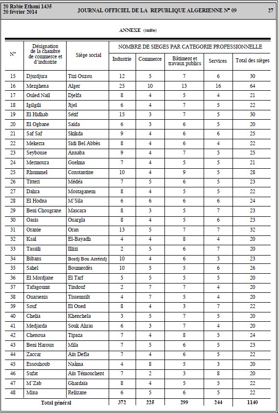 Arrêté du 16 Rabie Ethani 1435 correspondant au 16 février 2014 portant répartition des sièges des assemblées générales des chambres de commerce et dindustrie.