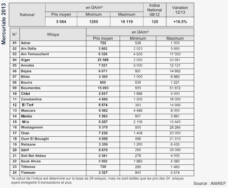 La mercuriale porte sur les prix des transactions du foncier économique. Ces prix hors taxes, correspondent aux prix des transactions effectives. Ils sont établis à partir d’une enquête « exhaustive », adressée par l’ANIREF, à l’ensemble des sources administratives et professionnelles. La période de référence des transactions observées, qui représente la base 100 des indices, correspond à 2008. Le champ géographique couvert est le niveau national et wilaya. La première mercuriale couvre le niveau national ainsi que les wilayas les plus importantes.