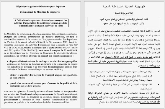 Le Ministère du commerce, porte à la connaissance des opérateurs économiques exerçant des activités d’importation de matières premières, produits et marchandises destinés à la revente en l’état, qu’en exécution des dispositions de l’article 5 du décret exécutif n°05-458 du 30 novembre 2005 fixant les modalités d’exercice des activités d’importation pour la revente en l’état (JO n°78 du 04.12.2005), modifié et complété par le décret exécutif n°13-141 du 10 avril 2013 (JO n°21 du 23.04.2013), sont tenus, à compter du 23 avril 2014, de se faire délivrer par les Directions du Commerce de wilaya territorialement compétentes, un certificat attestant du respect des conditions suivantes :